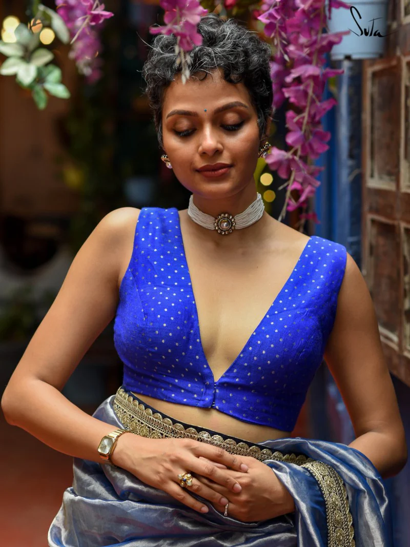 Home Blouse Blue Silk Sleeveless V Neck Benarasi Blouse