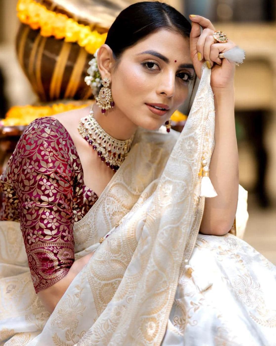 • The last image gives a detailed look of the blouse piece that comes with this saree (The model is wearing a blouse from our in-house wardrobe)
