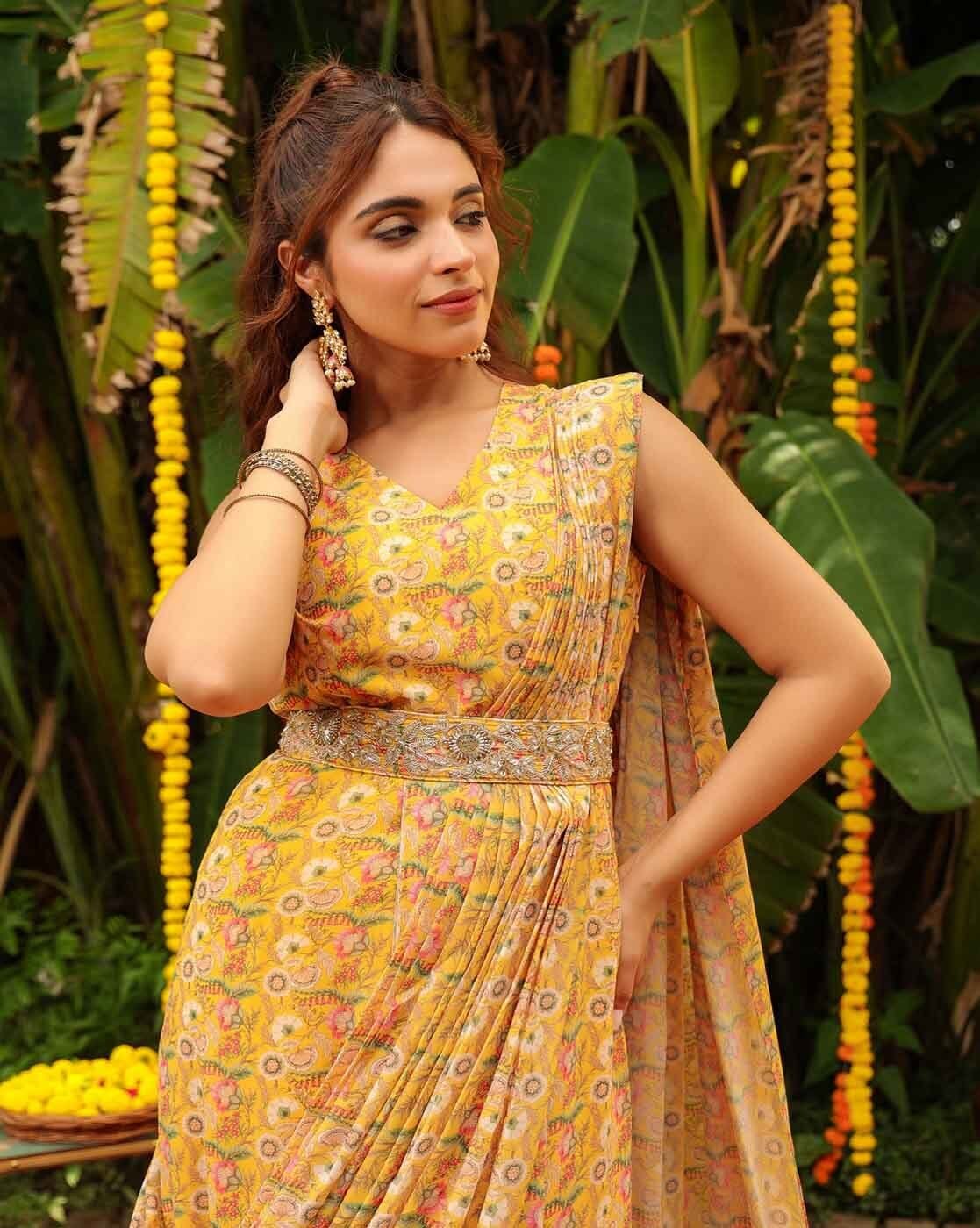 Women Floral Print Pre-Stitched Saree with Contrast Border